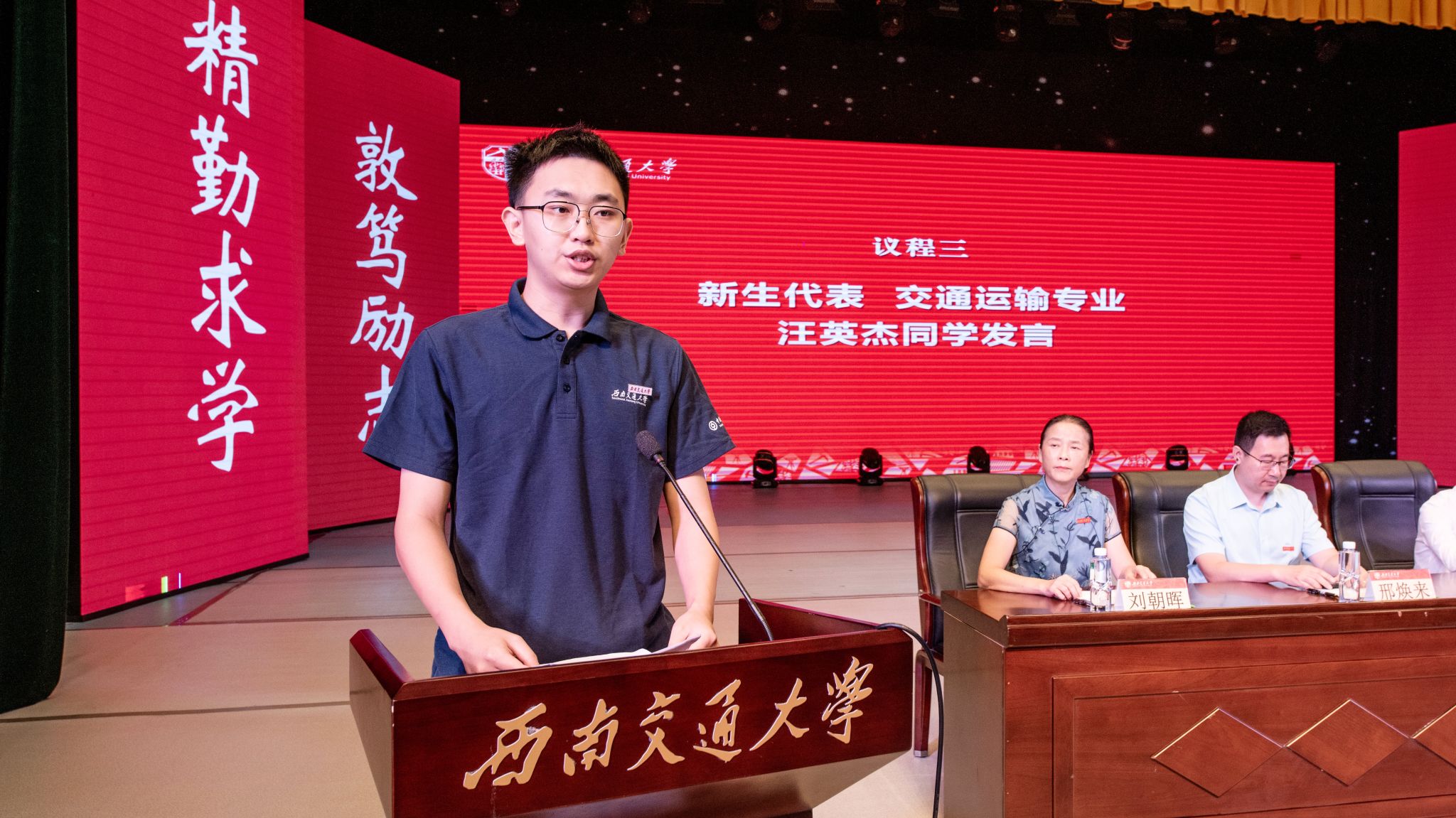 新生代表、交通运输专业汪英杰同学分享了自己从土木工程到交通运输的专业选择心路,表达了以学科融合服务“交通强国”建设的决心。他号召全体新生恪守交大校训、发扬交大精神,以归零心态潜心学习、勇于实践,将专业知识与创新精神融入国家发展的时代洪流。