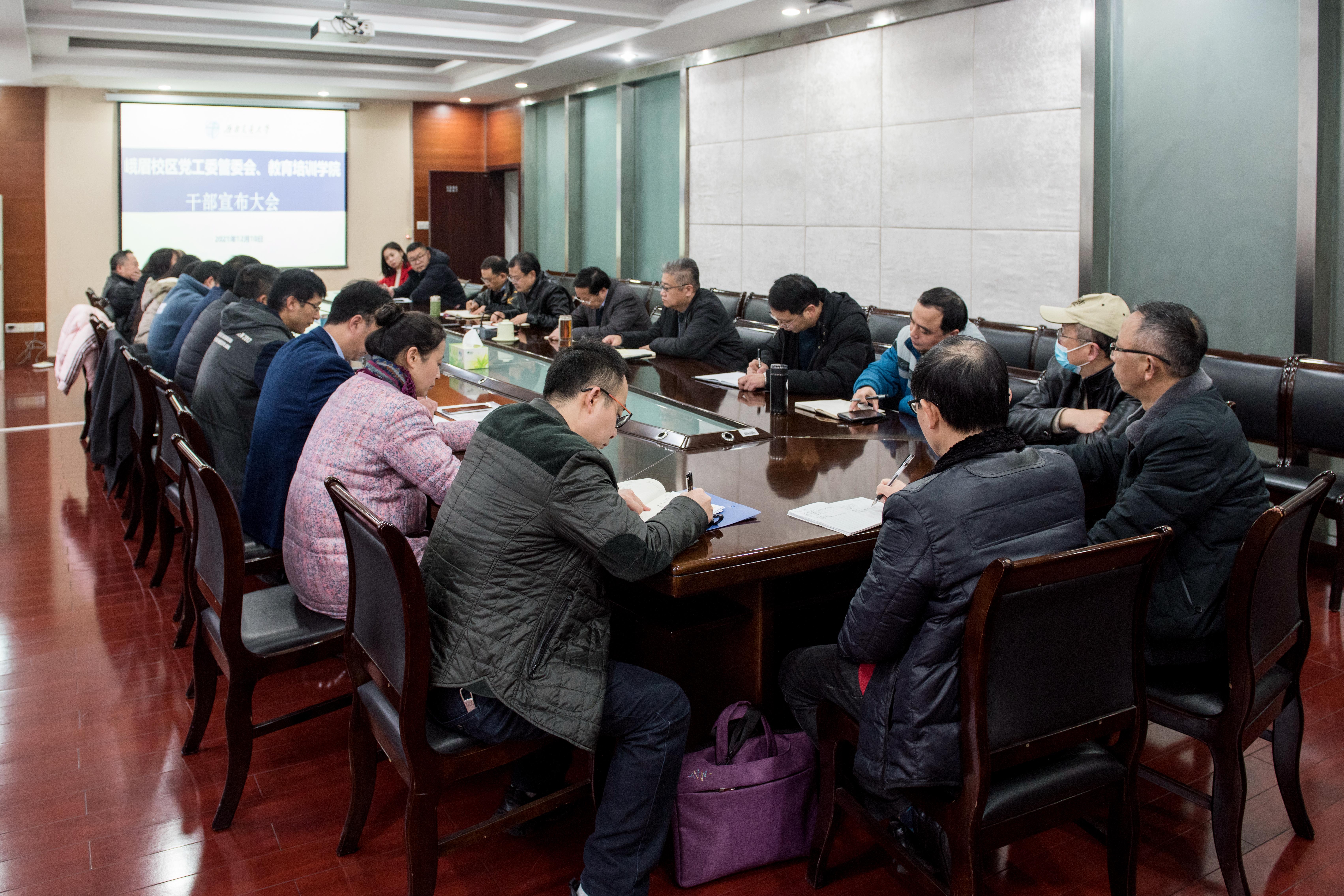 12月10日上午,峨眉校区党工委管委会、教育培训学院召开干部宣布大会。学校党委副书记沈火明和峨眉校区党工委管委会和教育培训学院全体科职以上干部及职工代表参加了会议,党委组织部部长韩旭东在线参加了会议。会议由峨眉校区管委会常务副主任、教育培训学院常务副院长谭建鑫主持。