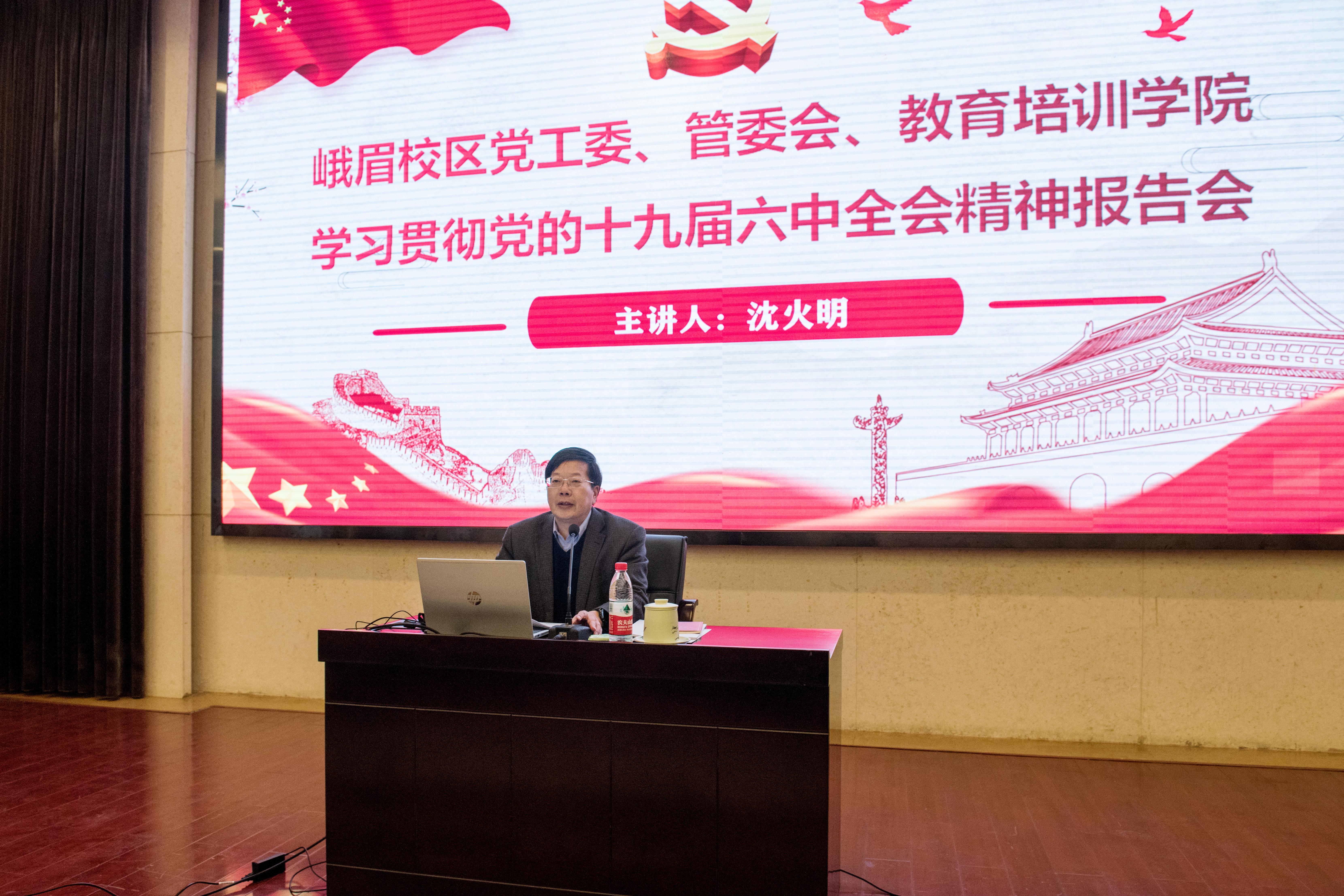 12月9日下午,为深入学习贯彻党的十九届六中全会精神,深刻把握、学深悟透习近平总书记重要讲话和《中共中央关于党的百年奋斗重大成就和历史经验的决议》(以下简称《决议》)的丰富内涵、精神实质,峨眉校区党工委管委会和教育培训学院在峨眉校区扬华讲堂召开了学习贯彻党的十九届六中全会精神报告会。峨眉校区党工委管委会和教育培训学院全体党员职工参加了会议。学校党委副书记沈火明同志领学了党的十九届六中全会精神。