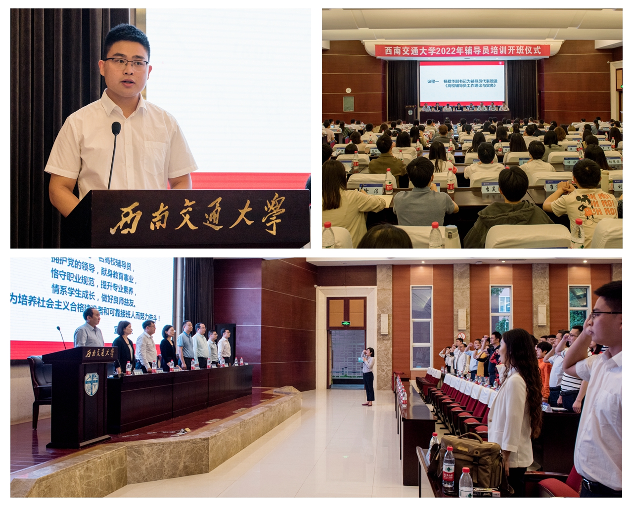 开班仪式上,杨爱华副书记为辅导员代表赠送了《高校辅导员工作理论与实务》一书;新上岗辅导员代表、土木工程学院专职辅导员李裕分享了他作为一名“新人”的心声;在四川省第六届“高校辅导员年度人物”、电气工程学院辅导员张异的带领下,全体辅导员重温《高校辅导员誓词》。