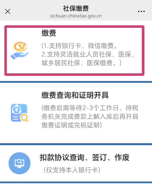 1. 微信搜索公众号"四川税务"(关注该公众号) ——进入公众号——"办税缴费"——"社保缴费"——"缴费"——选择任一收费渠道——填写相关信息,并在选择险种时选择“城乡居民医疗保险",提交并完成缴费。