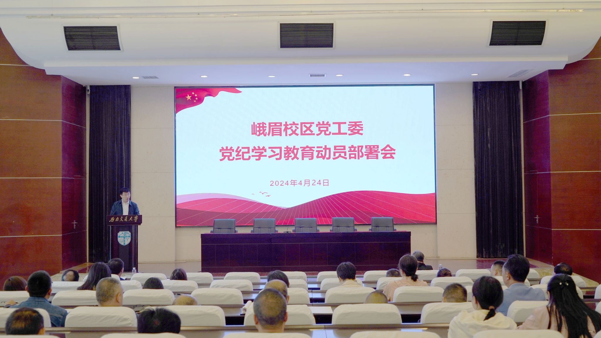 4月24日下午,峨眉校区党工委召开党纪学习教育动员部署会议,传达《中共中央办公厅关于在全党开展党纪学习教育的通知》精神,教育部党组和学校党委关于党纪学习教育的要求,并对校区党纪学习教育工作进行安排部署。峨眉校区全体教职工党员及离退党员代表参加会议,会议由党工委委员、管委会副主任陈诗伟主持,党工委常务副书记郑简平作动员部署,党工委书记、管委会主任宋新出席会议并讲话。