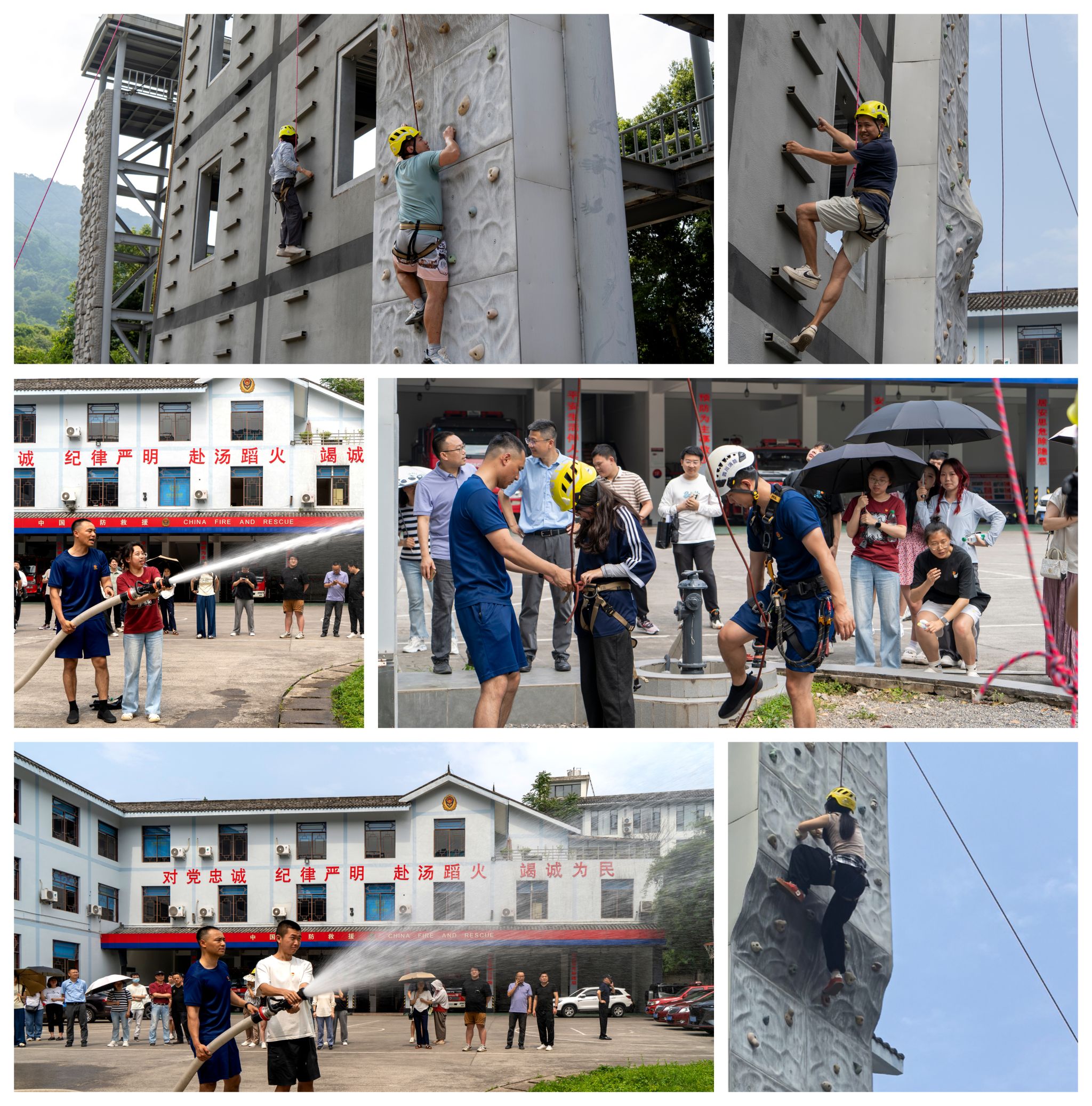 理论学习后,消防员进行实操指导,演示水枪水带快速连接技巧。师生分组练习,体验近距离点射灭火和远距离洒水覆盖。此外,活动还特别设置了攀岩技能体验环节,消防员结合救援实战经验,讲解了攀岩装备的使用方法及安全注意事项,师生们在专业指导下,挑战垂直攀岩墙,通过团队协作克服心理障碍,深刻体会到消防员日常训练的艰辛与勇气。