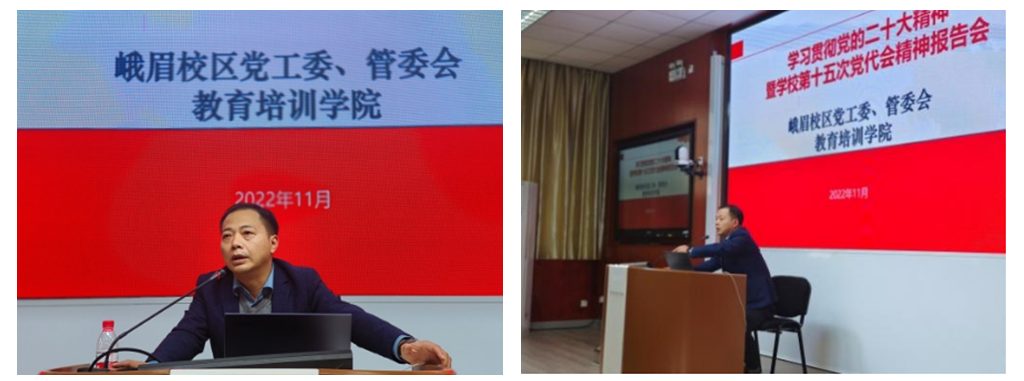 11月17日,为深入学习宣传贯彻党的二十大精神和学校第十五次党代会精神,峨眉校区党工委、教育培训学院党委在七上阶梯教室开展了第一次集中学习宣讲活动。峨眉校区党工委常务副书记、教育培训学院党委常务副书记宋刚领学了学校第十五次党代会精神,峨眉校区党工委副书记郑简平领学了党的二十大精神。学习活动由教育培训学院党委副书记程军主持。