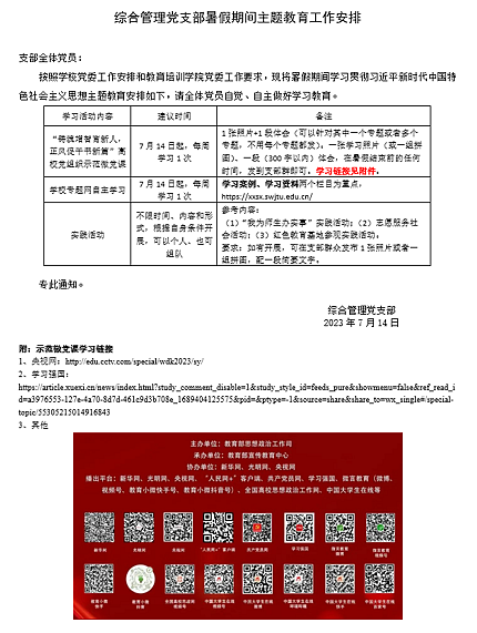 为将学习贯彻习近平新时代中国特色社会主义思想走向深入,学习教育在暑假期间不放假、不断线,综合管理党支部组织全体党员在假期自觉、自主开展了学习教育和实践锻炼。