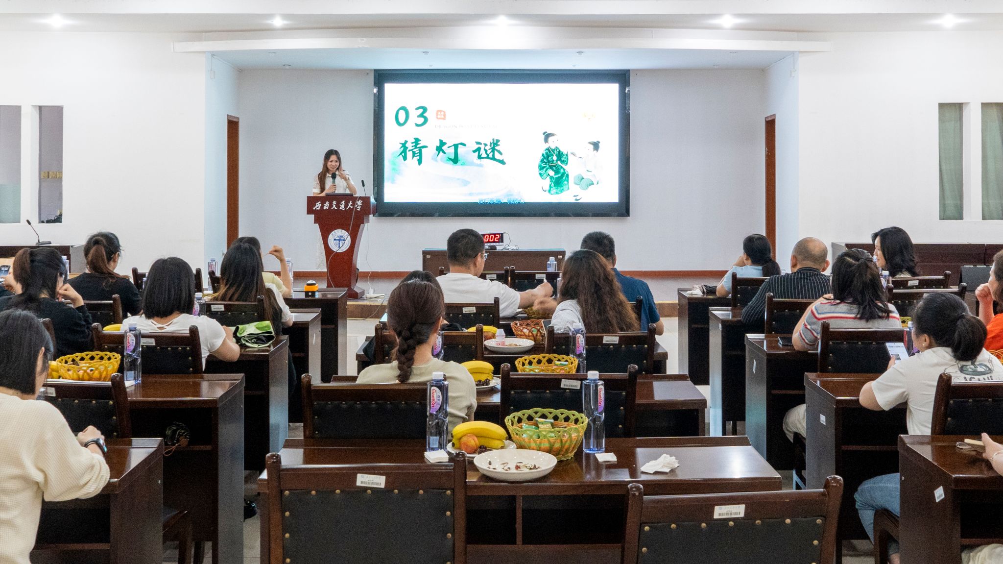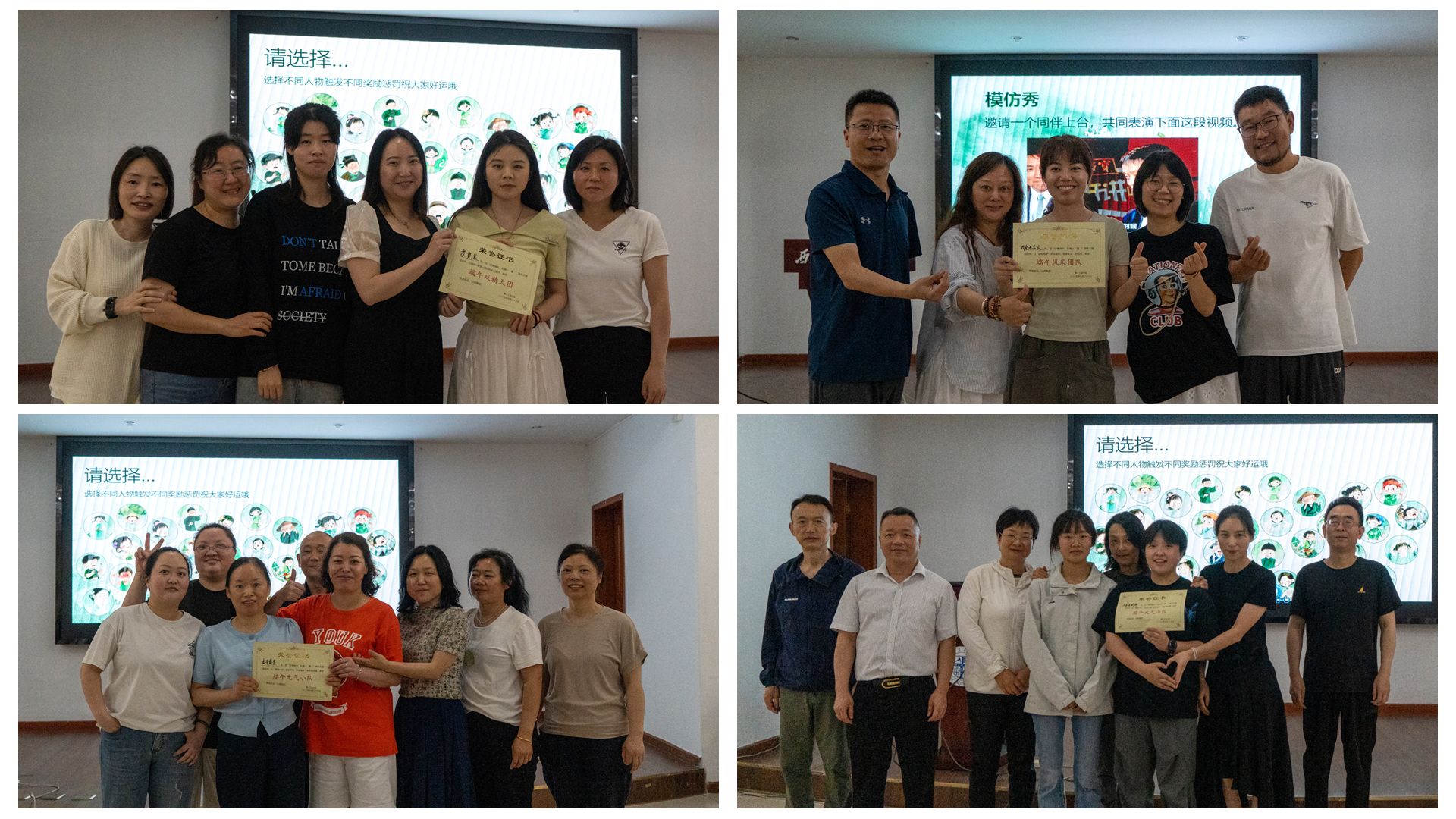 随后,现场开展了形式多样的端午主题互动活动:既有考验文化知识的"端午知识闯关",又有妙趣横生的"emoji猜成语";既有彰显智慧的传统灯谜竞猜,又有默契十足的"你划我猜"互动游戏。参与教职工分为四支队伍展开角逐,最终“聚宝盆”队凭借出色表现荣获“端午戏精天团”称号,“我竟无言以对”队获评“端午风采团队”,“书香兰亭”队和“大家说的都对”队则获得“端午元气小队”称号。