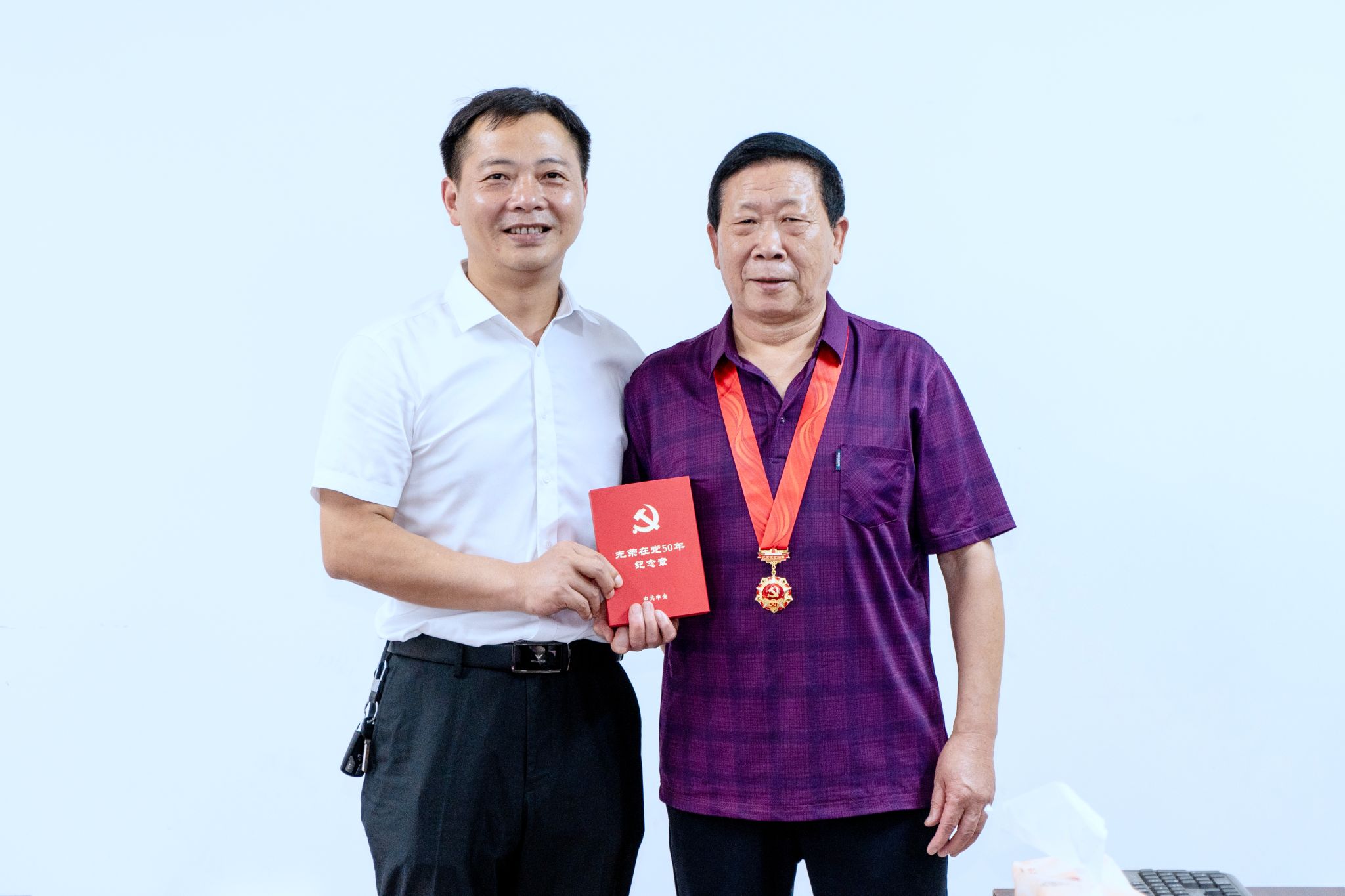 会上,郑简平同志为“光荣在党50年”的老党员徐成刚同志颁发纪念章,并送上校区精心准备的礼物。