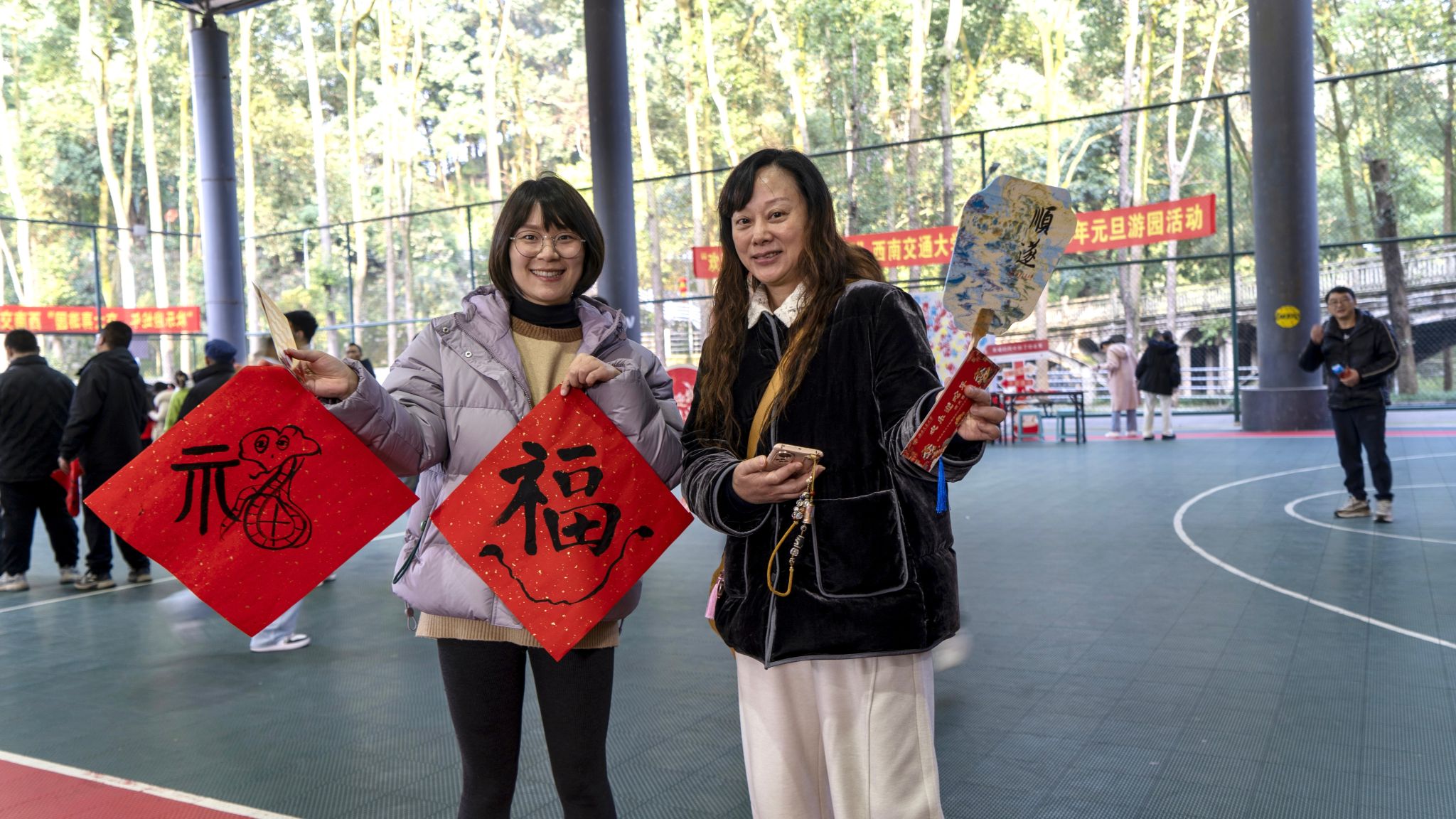 本次游园会不仅设置了“缤纷盖手印”“一起来套圈”“弹珠夹夹乐”“投球大挑战”“赶小鸡入笼”“欢乐垫排球”等六项游戏项目,还设置了“画蛇添福” “DIY非遗漆扇”两项文化体验项目。师生们在妙趣横生的游园项目中集章打卡,兑换交大文创礼品,收获新年祝福,“忙碌”的身影、灿烂的笑脸,一个个美好瞬间被定格记录。