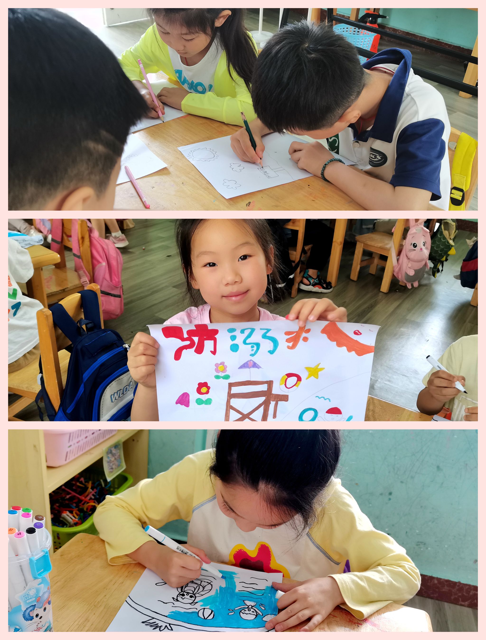 大班: 开设“防溺水知识小课堂”,组织幼儿观看真实案例视频,引导其通过分析讨论深刻认识溺水的严重后果。孩子们还动手绘制了“防溺水安全手抄报”,用五彩画笔表达自己对防溺水的理解,进一步巩固了所学安全知识。