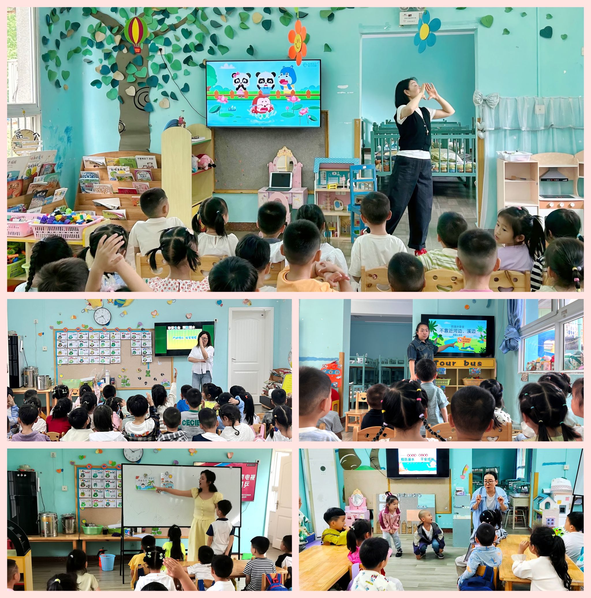 小小班与小班: 以《不靠近池塘、河边、溪边》为主题,教师运用生动的肢体语言和情景模拟,引导幼儿直观感知“池塘危险,不能独自玩水”的道理。在互动环节,孩子们兴致勃勃地跟随老师学习朗朗上口的“防溺水三字经”,将安全准则牢牢铭记于心。