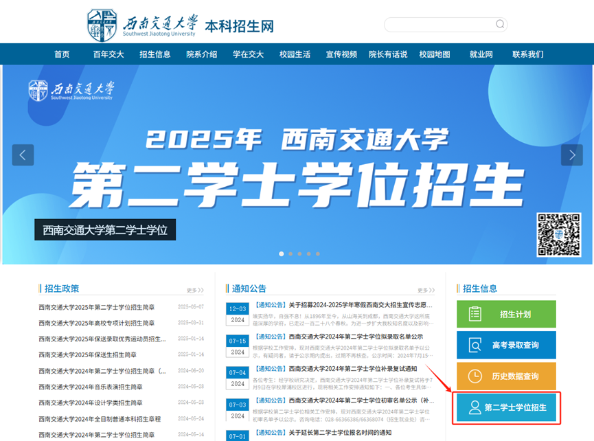访问william威廉中文官网本科招生网https://zhaosheng.swjtu.edu.cn/,点击“第二学士学位招生”进入报名系统;或直接访问https://cjcx.swjtu.edu.cn/exw/进入报名系统。报名前请仔细阅读报名注意事项和《william威廉中文官网2025年第二学士学位招生简章》(https://zhaosheng.swjtu.edu.cn/info/1047/2599.htm)