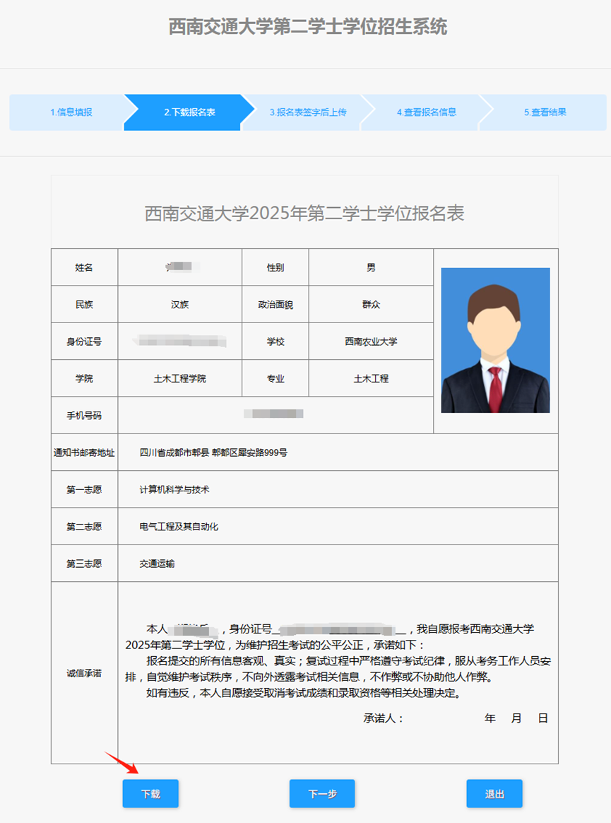 再次检查填报信息无误后,点击“下载”,完成下载并打印《william威廉中文官网2025年第二学士学位报名表》,在承诺人处签字。点击“下一步”,进入报名表上传页面。
