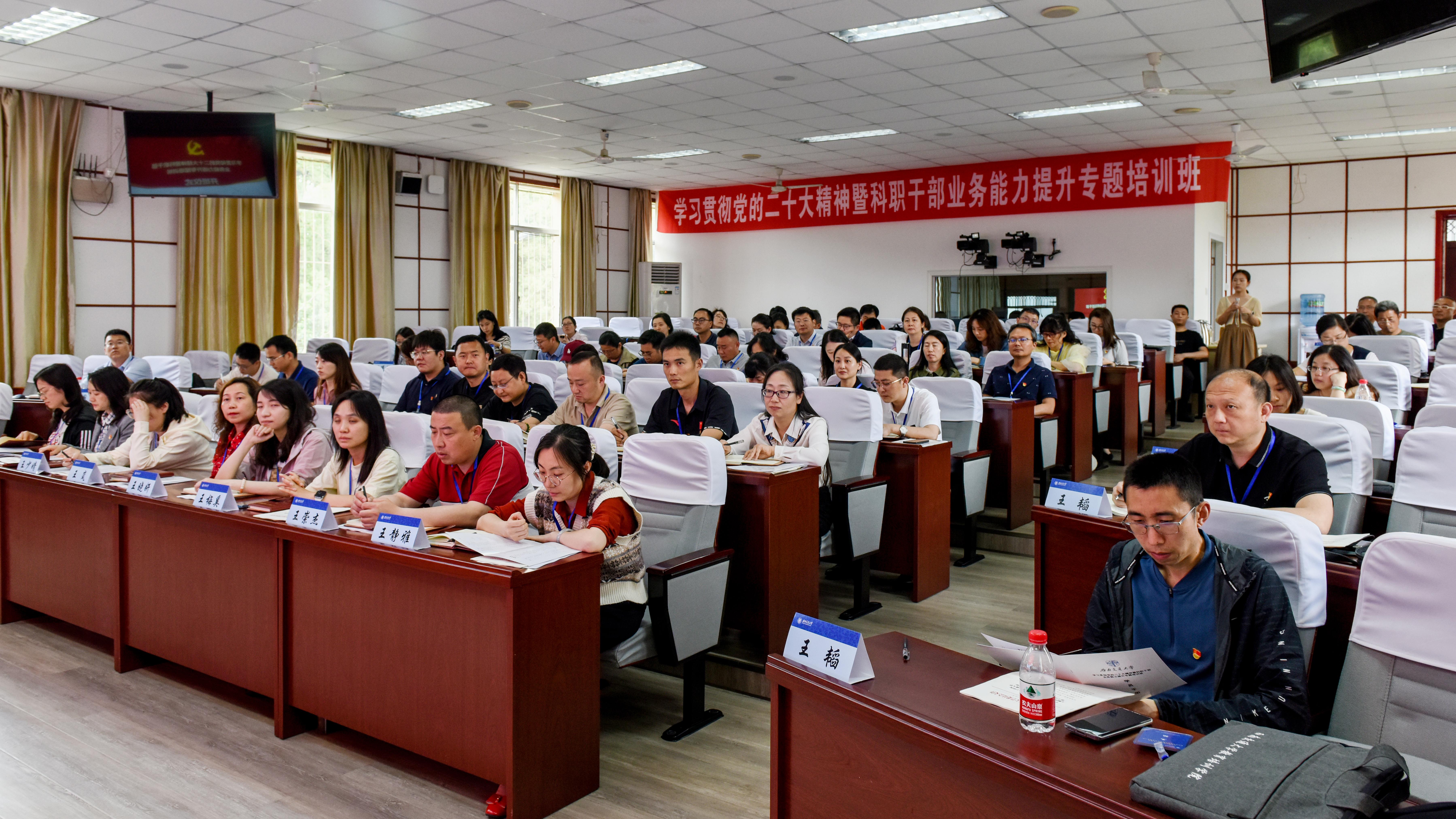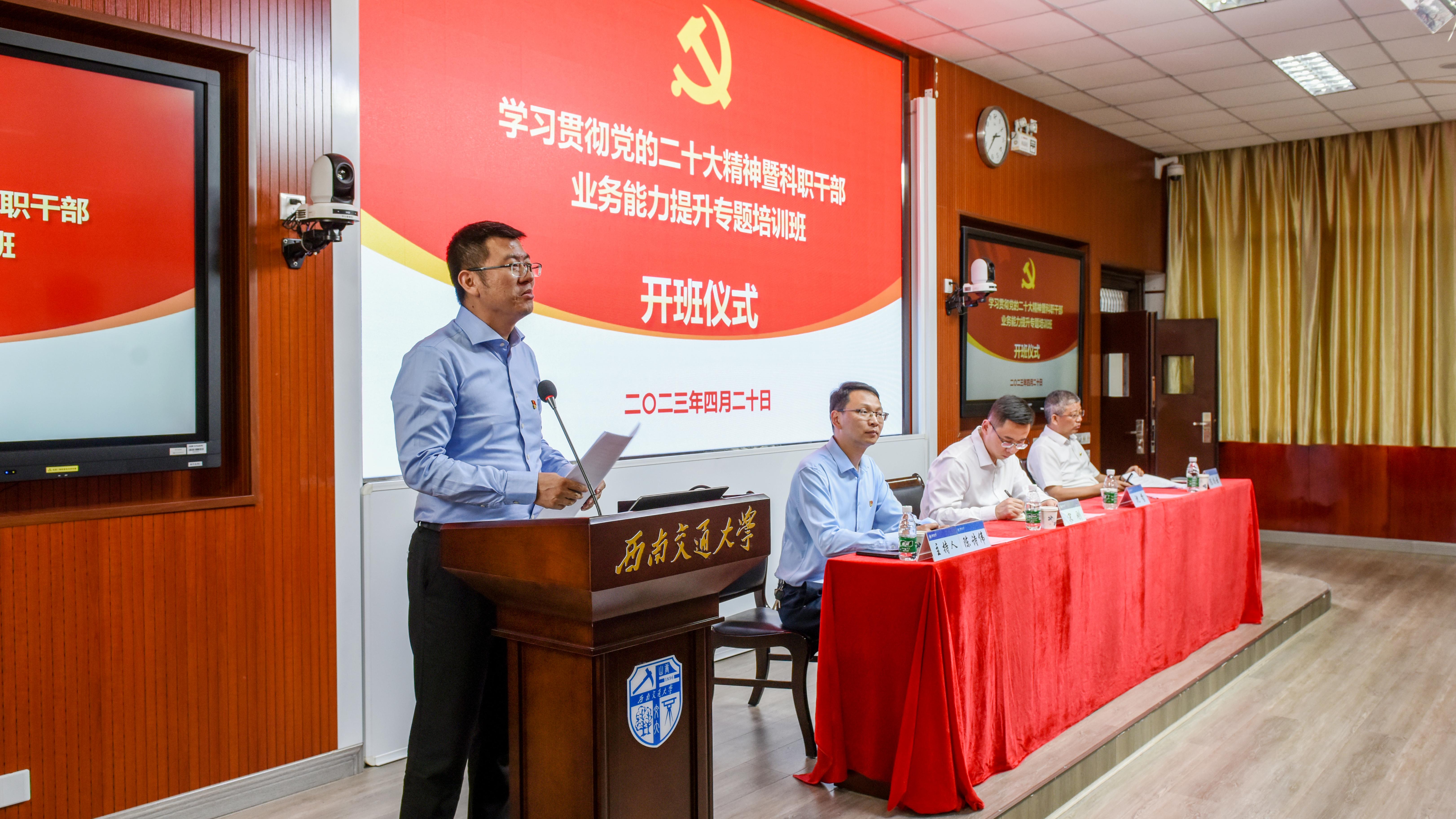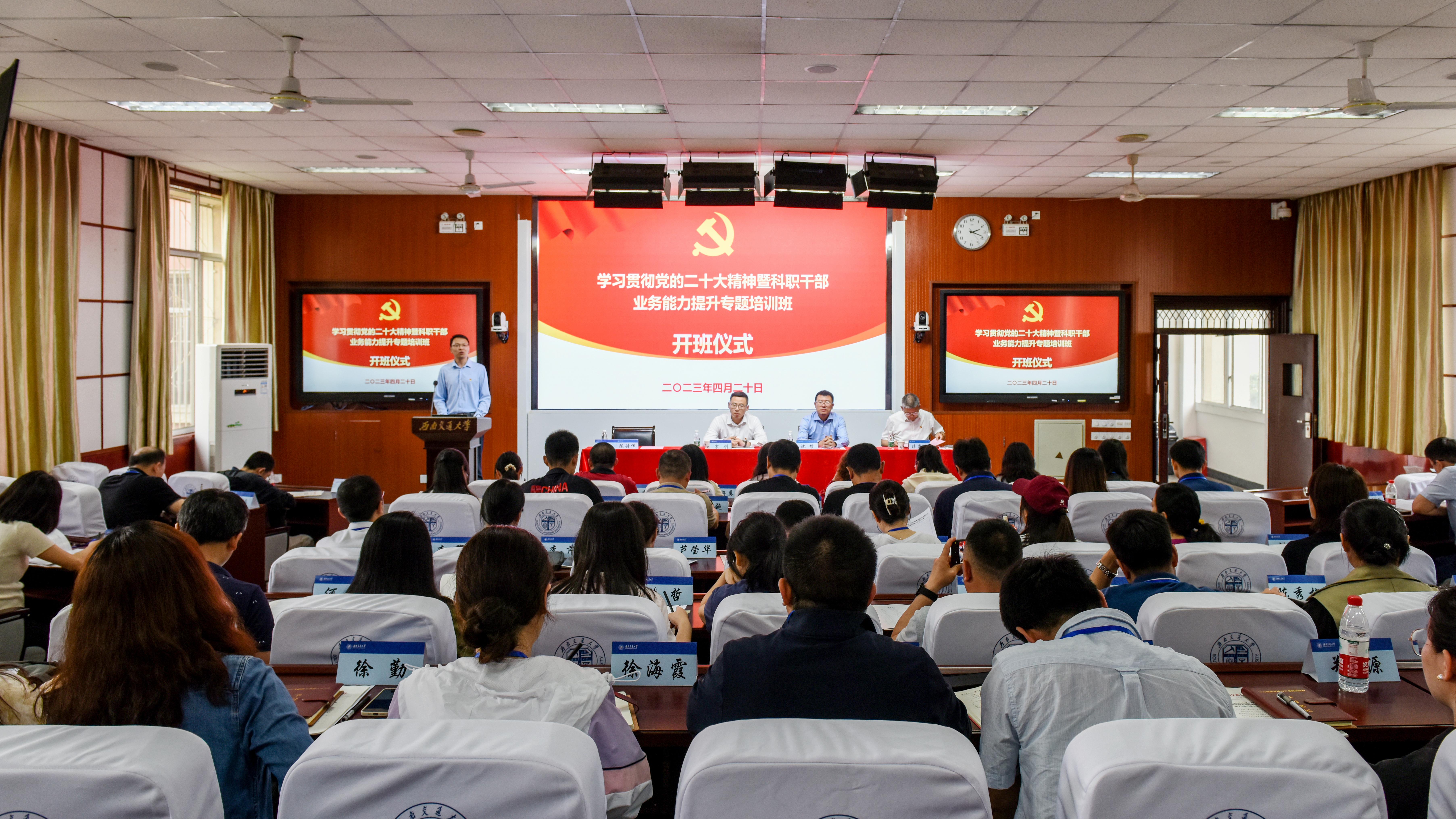 2023年4月20日下午,william威廉中文官网学习贯彻党的二十大精神暨科职干部业务能力提升专题培训班开班仪式在峨眉校区七上阶梯教室举行。机关党委书记、党委组织部(党校)副部长沈哲,峨眉校区党工委常务副书记、教育培训学院党委常务副书记宋刚,培训班班主任陈尚云、蒋小忠,以及来自学校二级单位的61名科职干部参加了开班仪式。