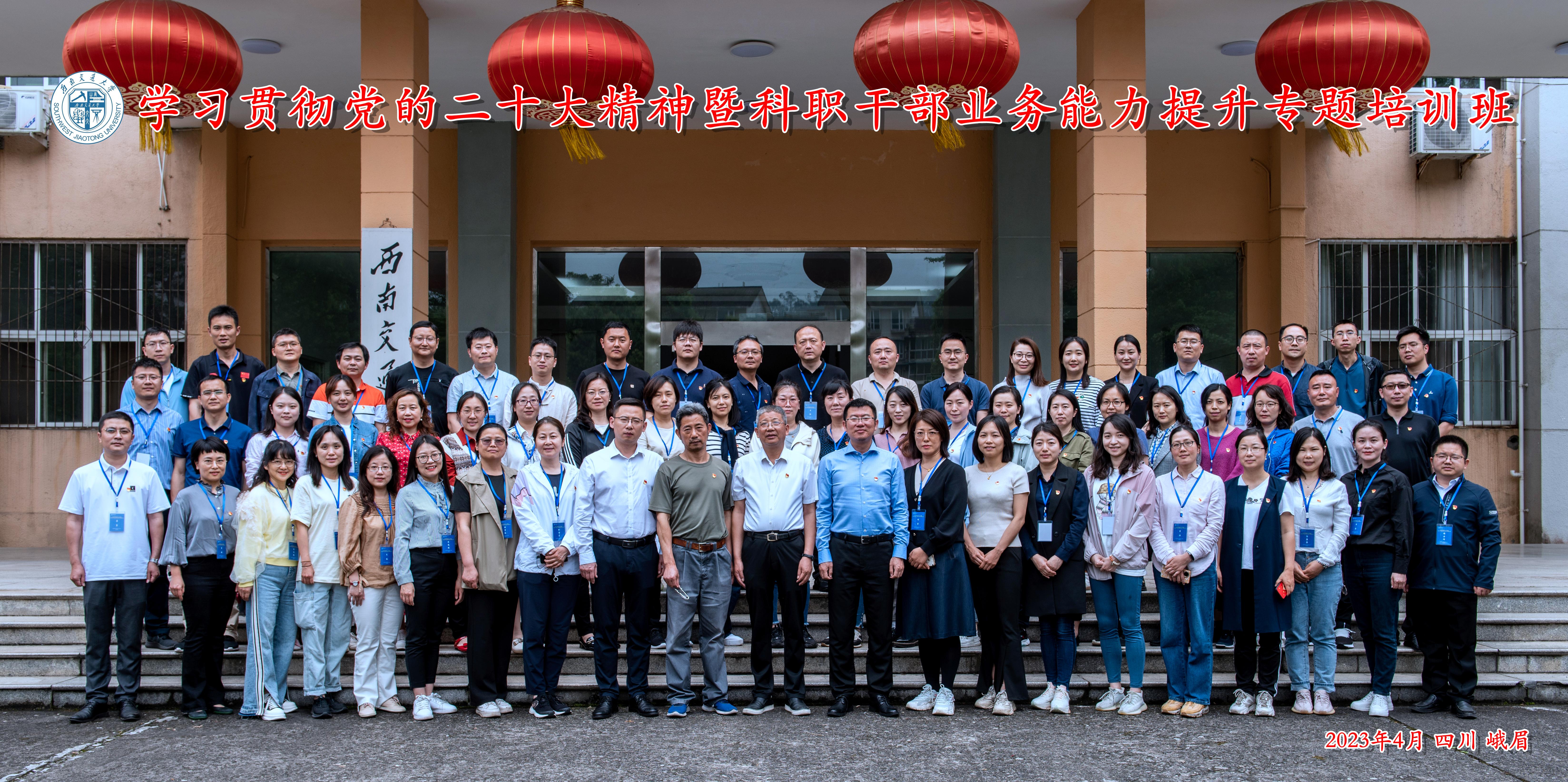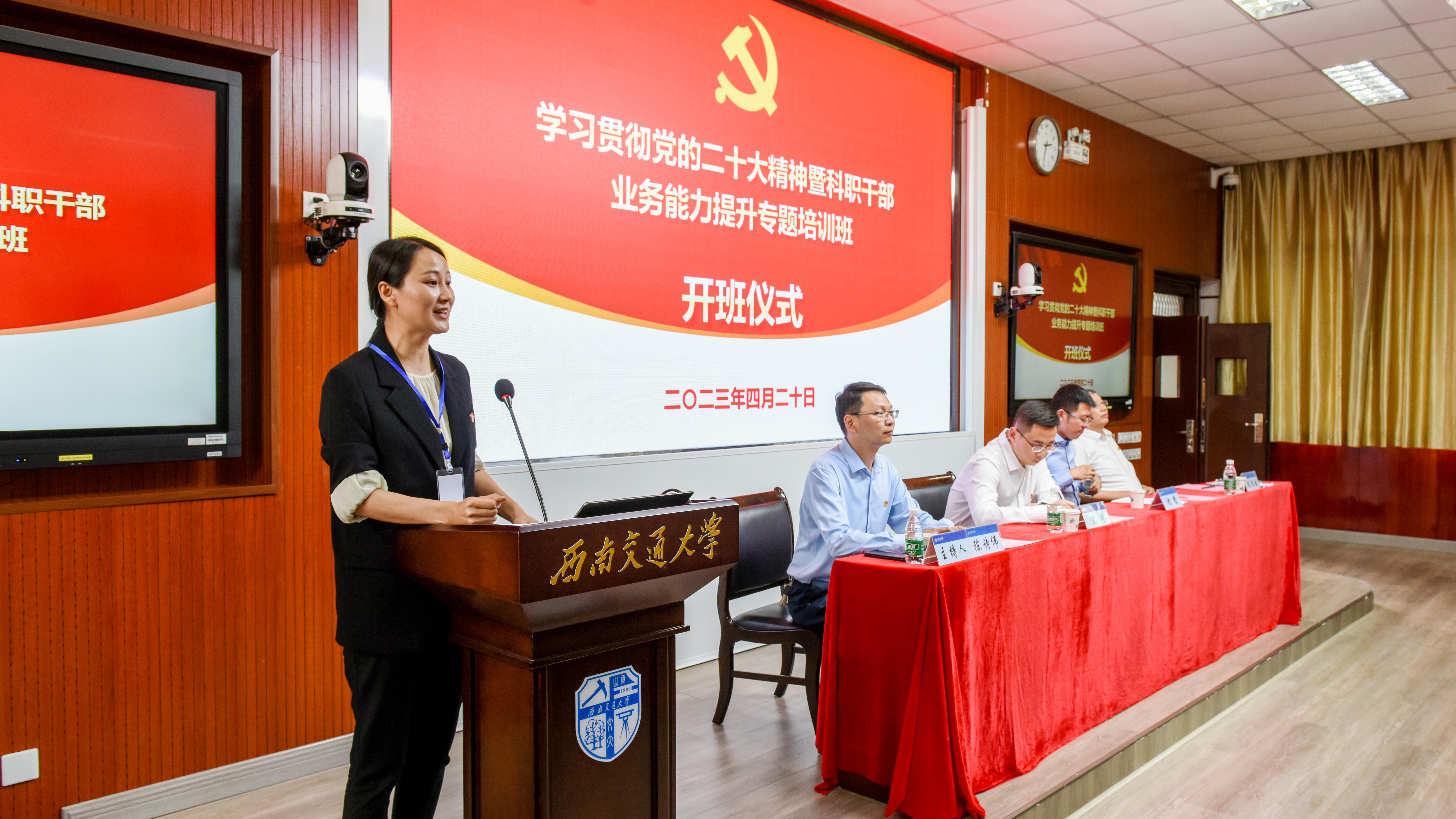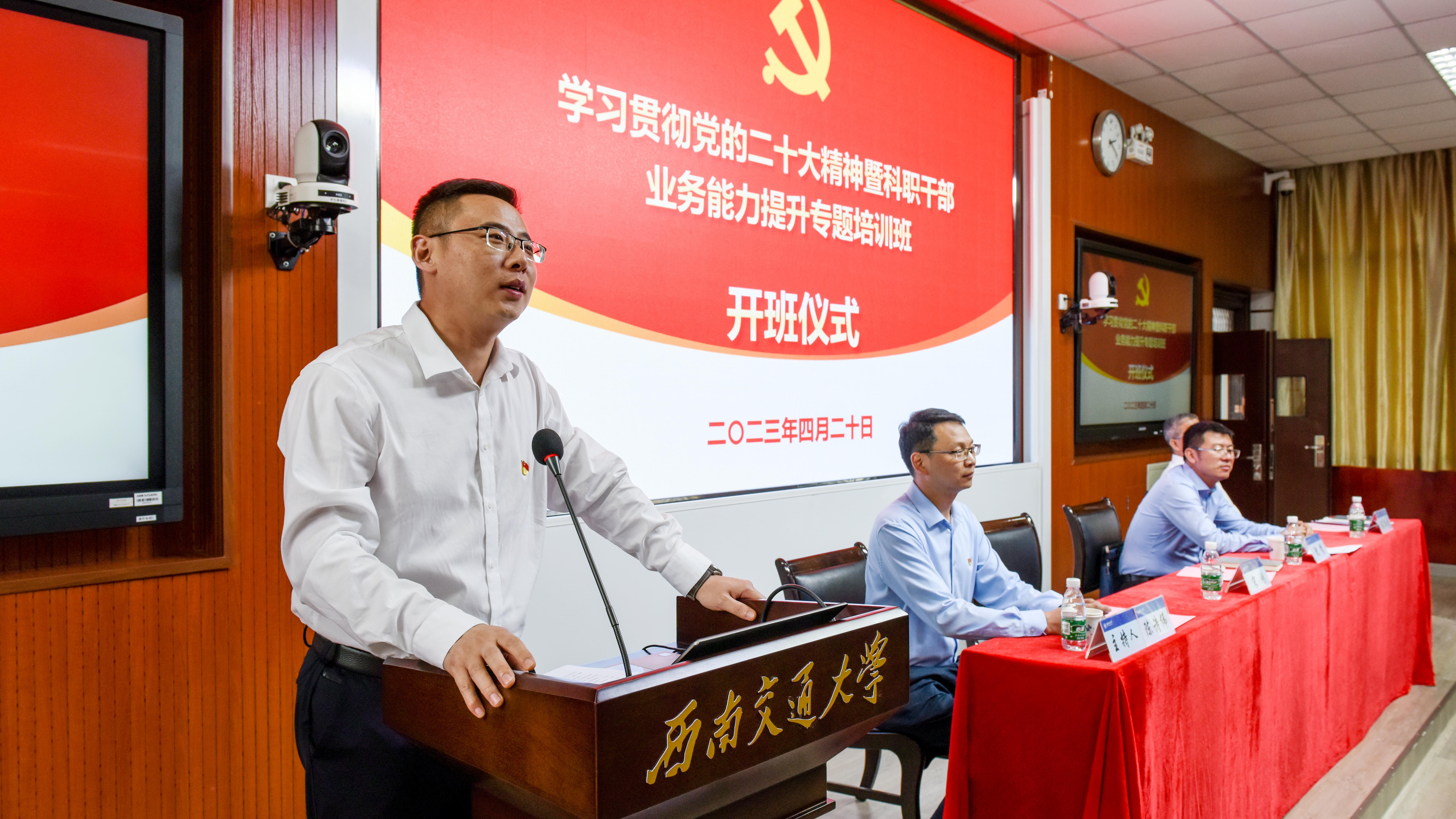 2023年4月20日下午,william威廉中文官网学习贯彻党的二十大精神暨科职干部业务能力提升专题培训班开班仪式在峨眉校区七上阶梯教室举行。机关党委书记、党委组织部(党校)副部长沈哲,峨眉校区党工委常务副书记、教育培训学院党委常务副书记宋刚,培训班班主任陈尚云、蒋小忠,以及来自学校二级单位的61名科职干部参加了开班仪式。