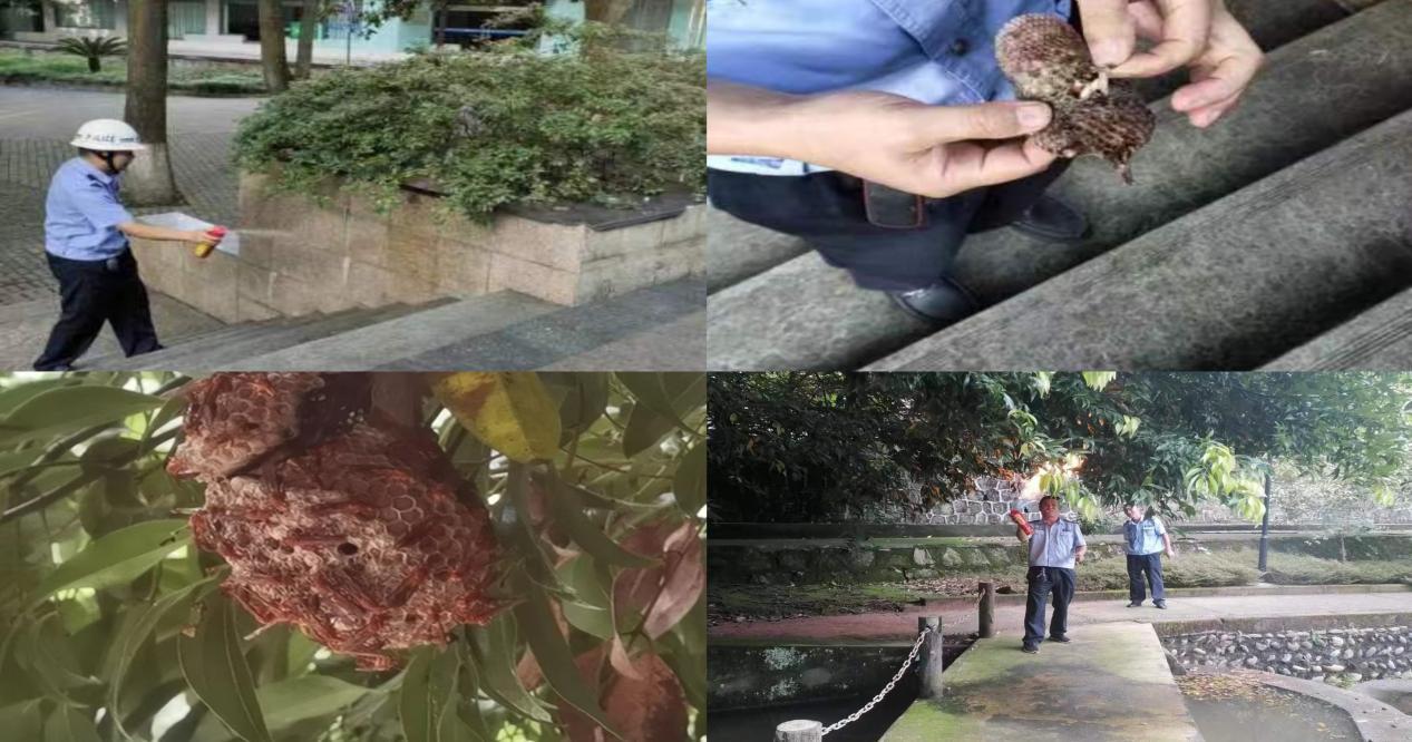 在校园的日常巡逻中,发现和处置教学楼、办公场所、公共区域10余处马蜂窝,避免了马蜂蜇人的隐患事件的发生。